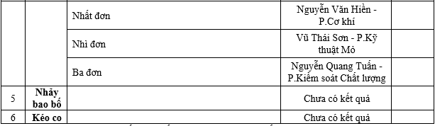 Sau đây là kết quả giải thi đấu thể thao lần thứ 14 của Công ty cập nhật đến ngày 26/05/2022: