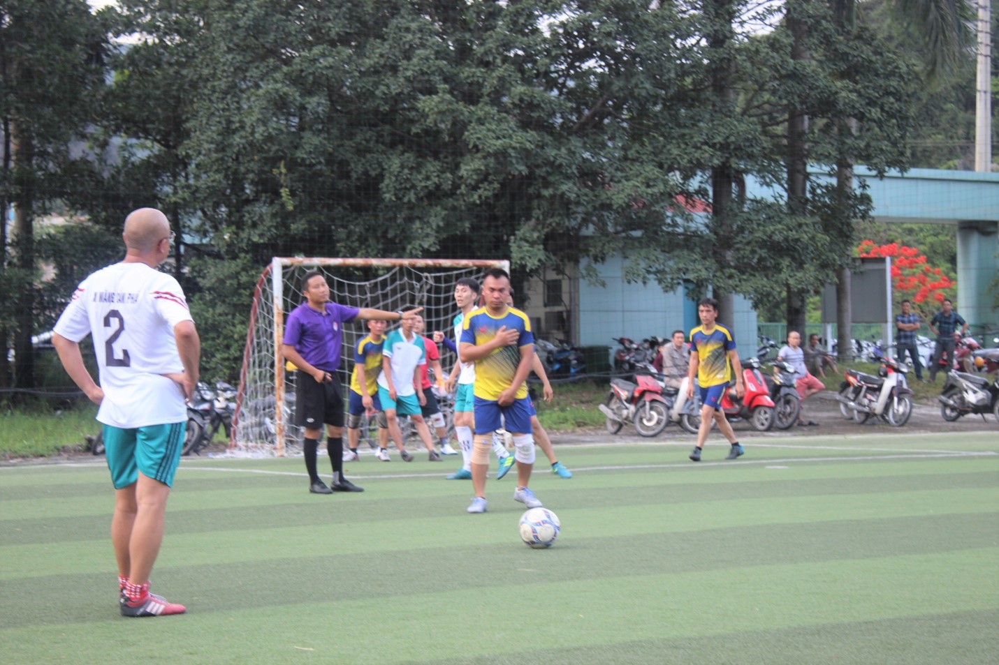 Đ/c Thượng tá Trần Quang Hưng - Tổng Giám đốc Công ty chuẩn bị thực hiện quả sút phạt, ghi bàn thắng ấn định tỉ số 2-1 mang về chiến thắng cho Liên quân Văn phòng
