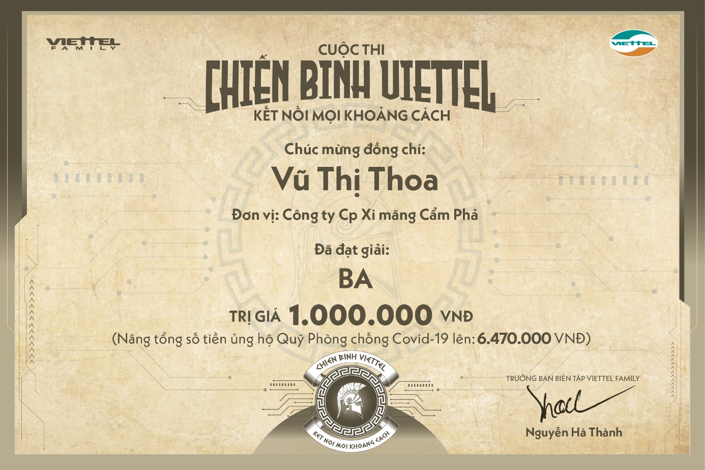 Tuy nhiên, chiến thắng cao nhất của Công ty CP Xi măng Cẩm Phả trong cuộc thi này đều thuộc về mọi CBCNV đã tham gia cuộc thi. Đây là một hoạt động rất ý nghĩa, khi chính CBCNV chúng ta đã tự tạo nên một khoản quỹ để cùng ủng hộ công cuộc phòng chống dịch Covid-19 do Mặt trận Tổ quốc Việt Nam cùng với các Bộ Ban Ngành tổ chức vận động, lan tỏa tinh thần lạc quan của người Viettel chúng ta.