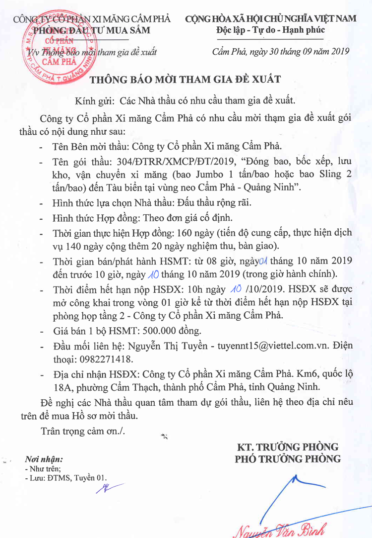 Đóng bao, bốc xếp, lưu kho, vận chuyển xi măng (bao Jumbo 1 tấn/bao hoặc bao Siling 2 tấn/ bao) đến Tầu biển tại vùng neo Cẩm Phả - Quảng Ninh