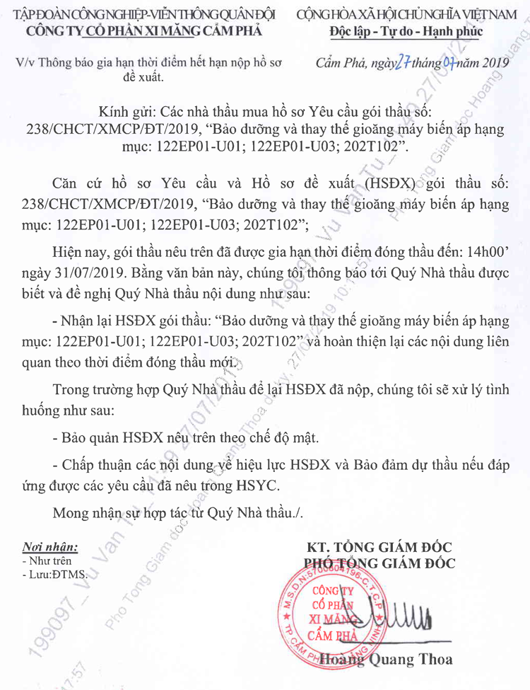 Gia hạn thời điểm hết hạn nộp hồ sơ đề xuất gói thầu Bảo dưỡng và thay thế gioăng máy biến áp hạng mục 122EP01-U01; 122EP01-U03; 202T102