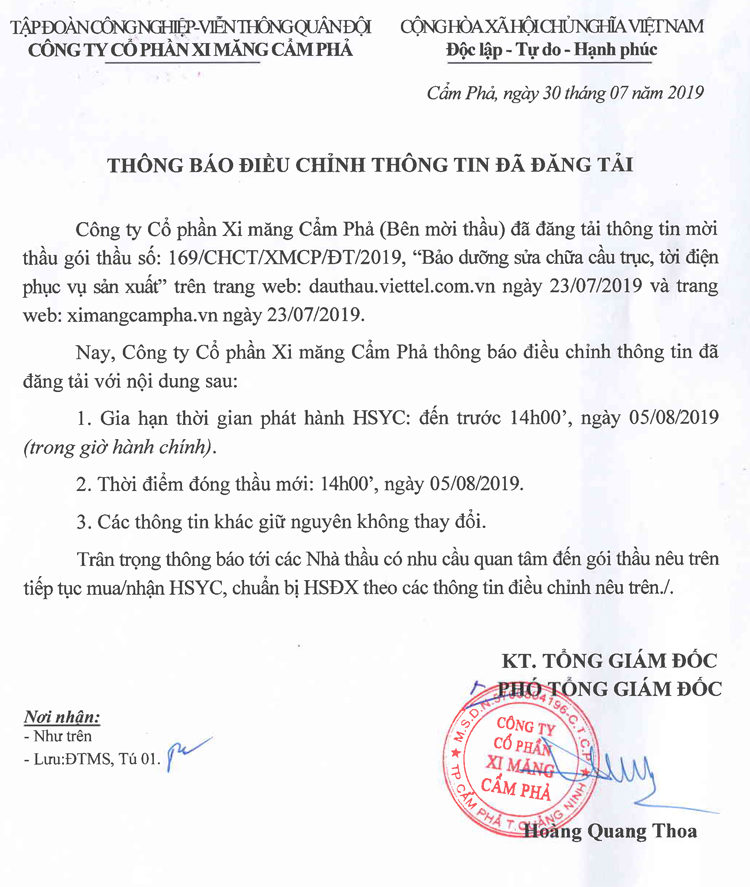 Thông báo điều chỉnh thông tin đã đăng tải gói thầu cung cấp dịch vụ bảo dưỡng cầu trục, tời điện phục vụ sản xuất