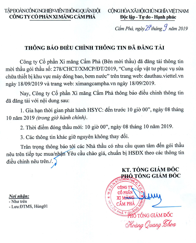 Thông báo điều chỉnh thông tin đã đăng tải gói thầu Cung cấp vật tư phục vụ sửa chữa thiết bị khu vực máy đóng bao, bơm nước