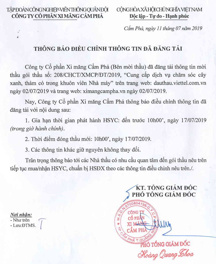 Thông báo điều chỉnh thông tin gói thầu Cung cấp dịch vụ chăm sóc cây xanh, thảm cỏ trong khuôn viên Nhà máy