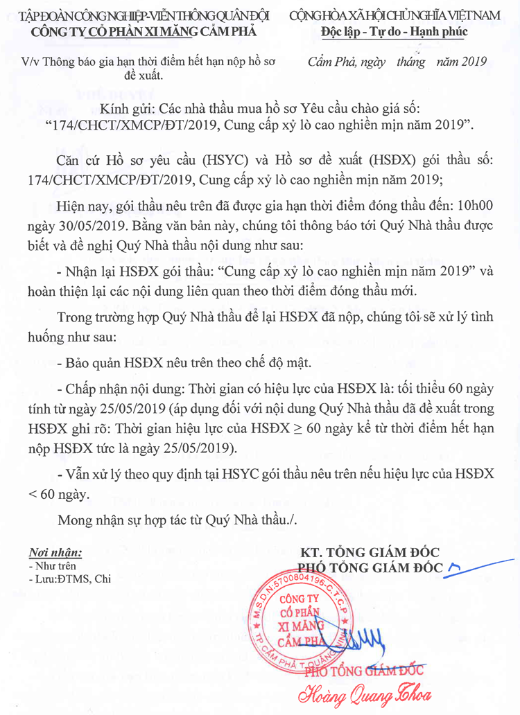 Thông báo gia hạn thời điểm hết hạn nộp hồ sơ đề xuất cung cấp xỷ lò cao nghiền mịn năm 2019