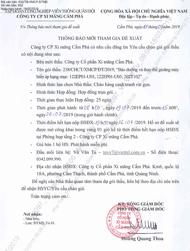 Thông báo mời tham gia đề xuất Bảo dưỡng và thay thế gioăng máy biến áp hạng mục 122EP01-U01; 122P01-U03; 202T102