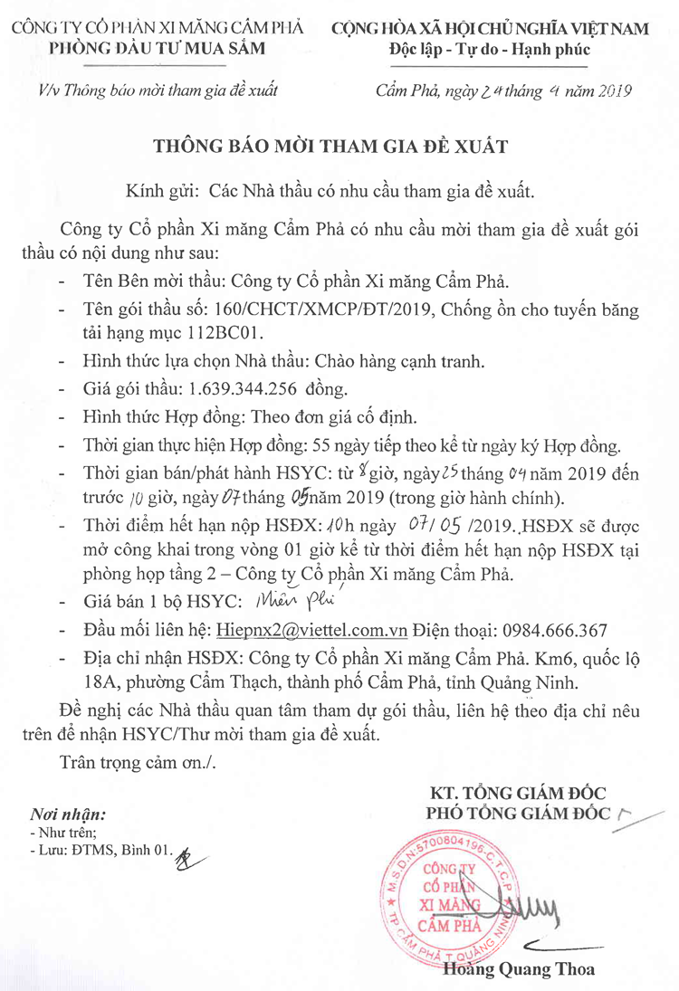 Thông báo mời tham gia đề xuất chống ồn cho tuyến băng tải hạng mục 112BC01