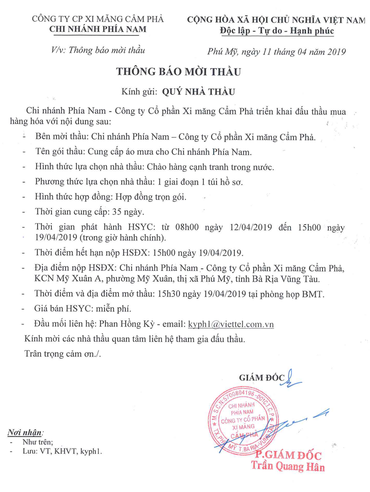 Thông báo mời tham gia đề xuất cung cấp áo mưa cho chi nhánh phía Nam