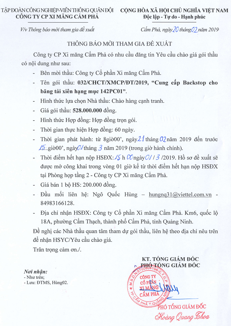 Thông báo mời tham gia đề xuất cung cấp Backstop cho băng tải xiên hạng mục 142PC01