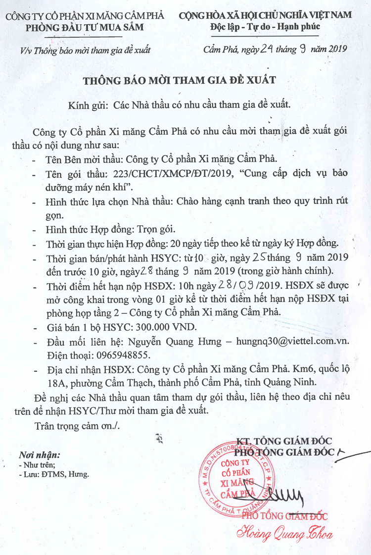 Thông báo mời tham gia đề xuất Cung cấp dịch vụ bảo dưỡng máy nén khí