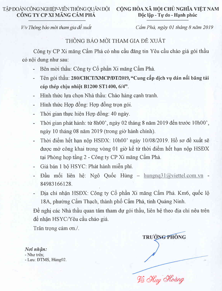 Thông báo mời tham gia đề xuất Cung cấp dịch vụ dán nối băng tải cáp thép chịu nhiệt B1200 ST1400