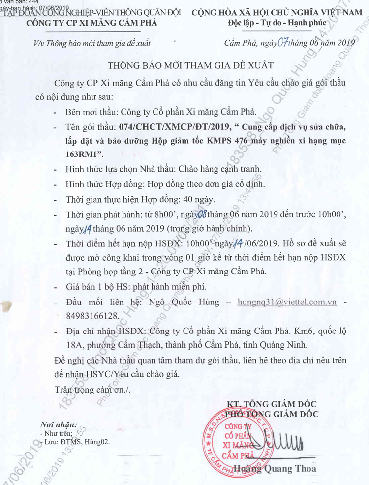 Thông báo mời tham gia đề xuất cung cấp dịch vụ sửa chữa, lắp đặt và bảo dưỡng hộp giảm tốc KMPS 476 máy nghiền xi hạng mục 163RM1