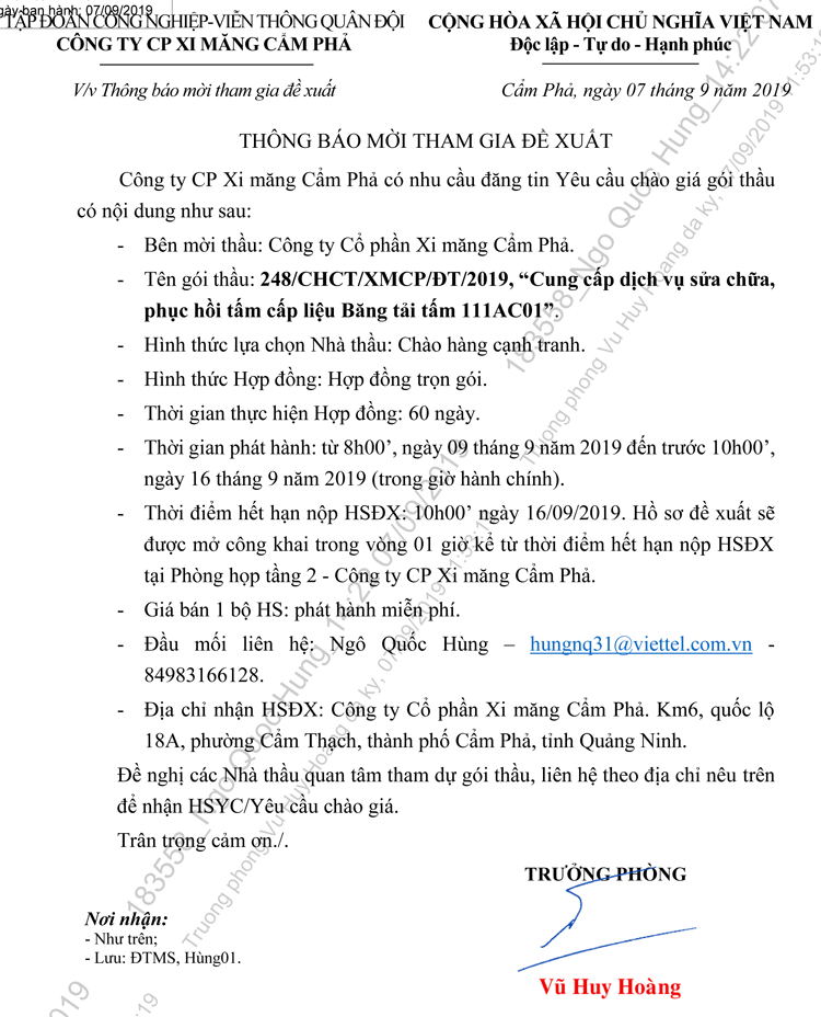Thông báo mời tham gia đề xuất cung cấp dịch vụ sửa chữa, phục hồi tấm cấp liệu băng tải tấm 111AC01