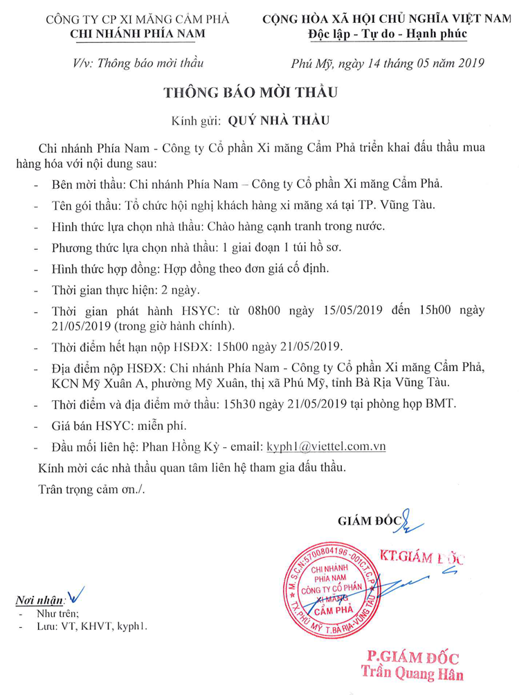 Thông báo mời tham gia đề xuất cung cấp dịch vụ Tổ chức hội nghị khách hàng xi măng xá tại thành phố Vũng Tàu