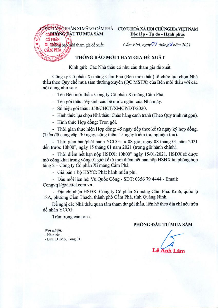 Thông báo mời tham gia đề xuất cung cấp dịch vụ vệ sinh các bể nước ngầm của nhà máy