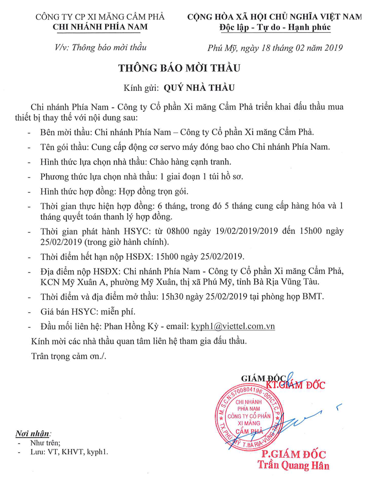 Thông báo mời tham gia đề xuất cung cấp động cơ servo cho máy đóng bao cho Chi nhánh phía Nam