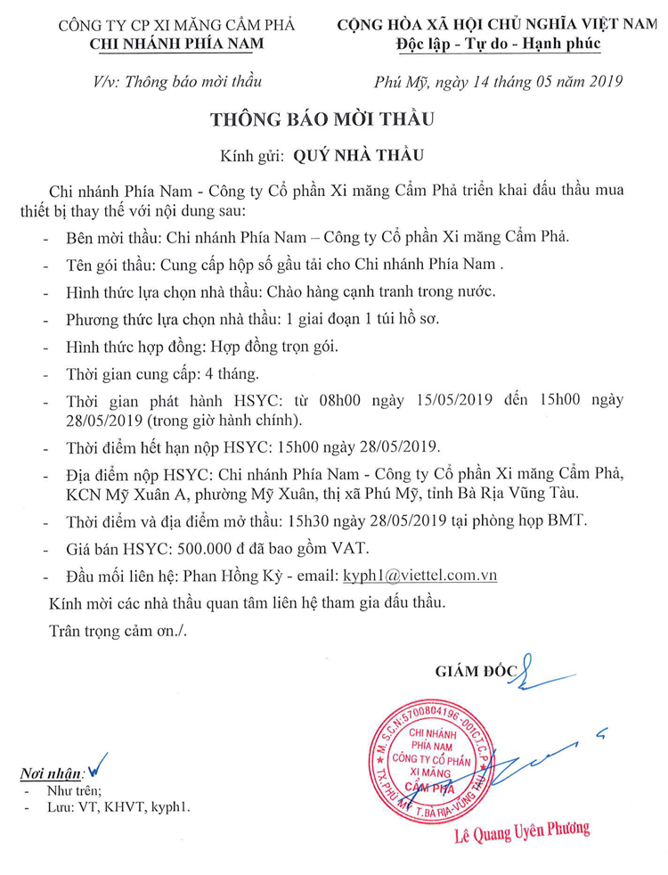 Thông báo mời tham gia đề xuất cung cấp hộp số gầu tải cho Chi nhánh phía Nam