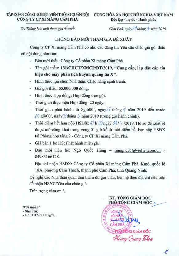 Thông bảo mời tham gia đề xuất cung cấp lắp đặt cáp tín hiệu cho máy phân tích huỳnh quang tia X