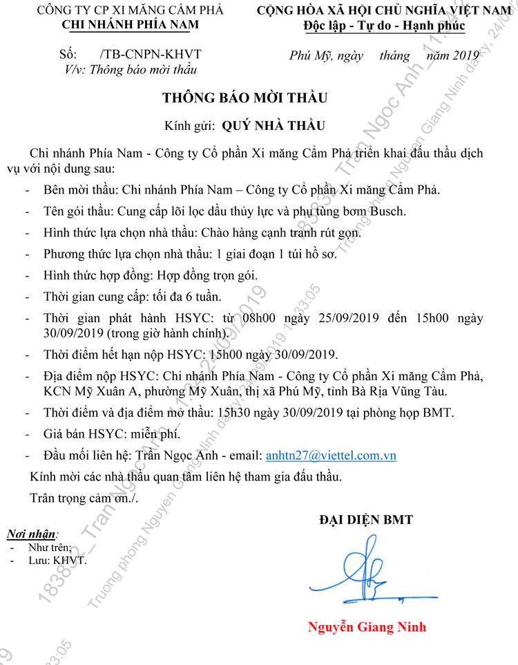 Thông báo mời tham gia đề xuất Cung cấp lõi lọc dầu thủy lực và phụ tùng bơm Busch