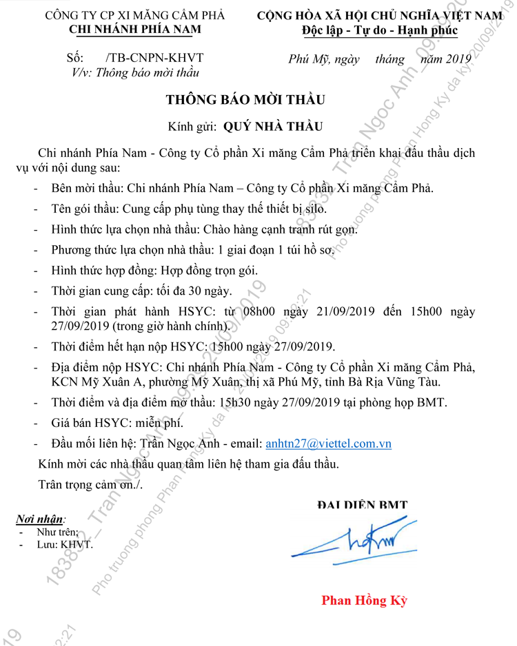 Thông báo mời tham gia đề xuất Cung cấp phụ tùng thay thế thiết bị Silo