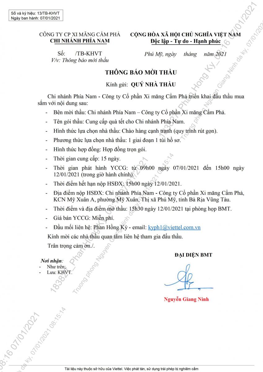 Thông báo mời tham gia đề xuất cung cấp quà tết cho chi nhánh Phía Nam