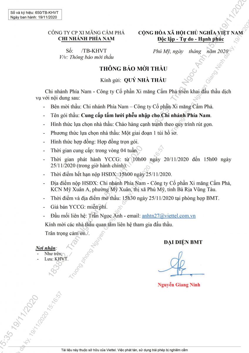 Thông báo mời tham gia đề xuất cung cấp tấm lưới phều nhập cho chi nhánh phía nam