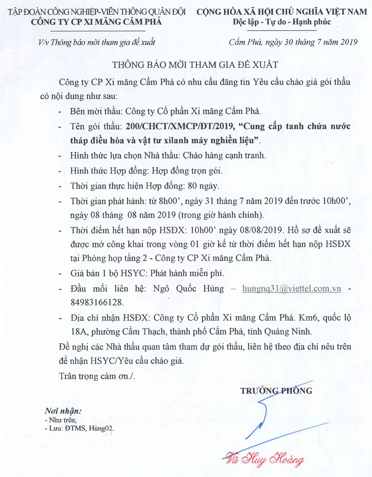 Thông báo mời tham gia đề xuất Cung cấp tanh chứa nước tháp điều hòa và vật tư xilanh máy nghiền liệu