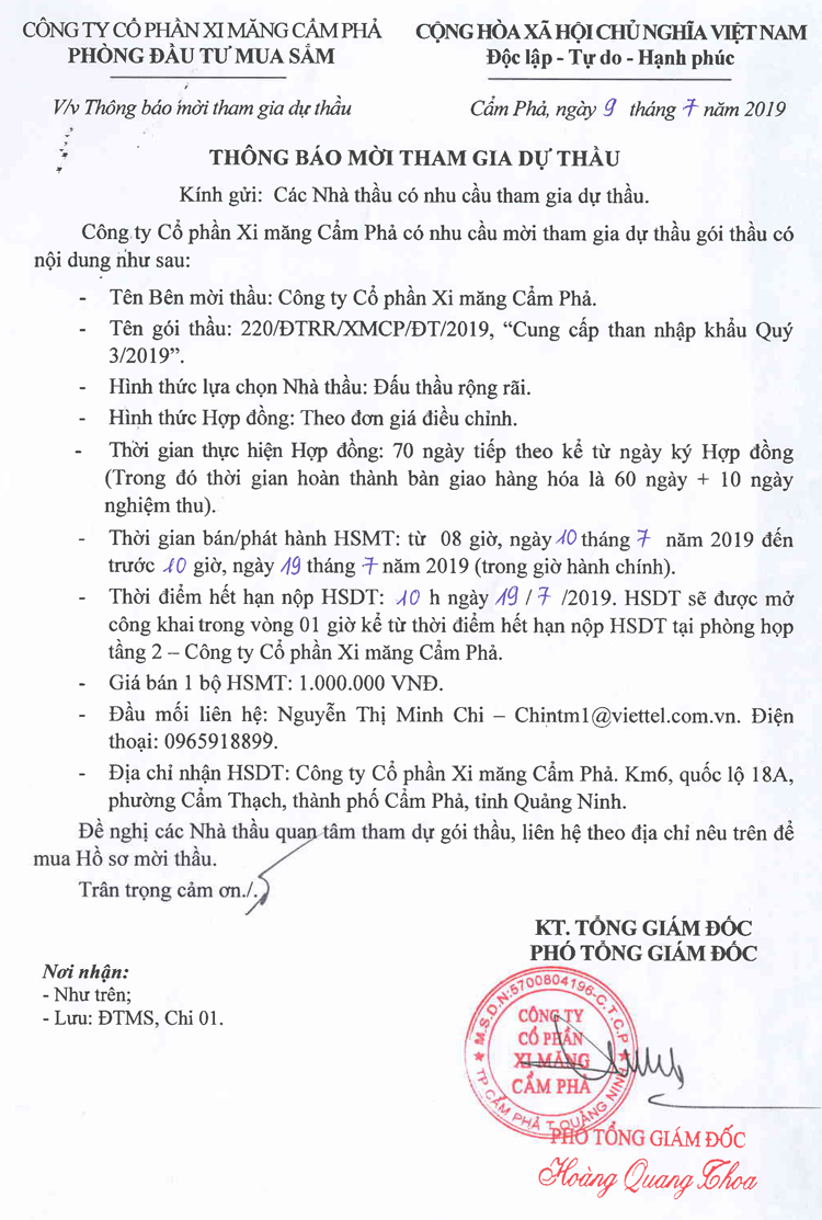 Thông báo mời tham gia đề xuất cung cấp than nhập khẩu Quý II/2019