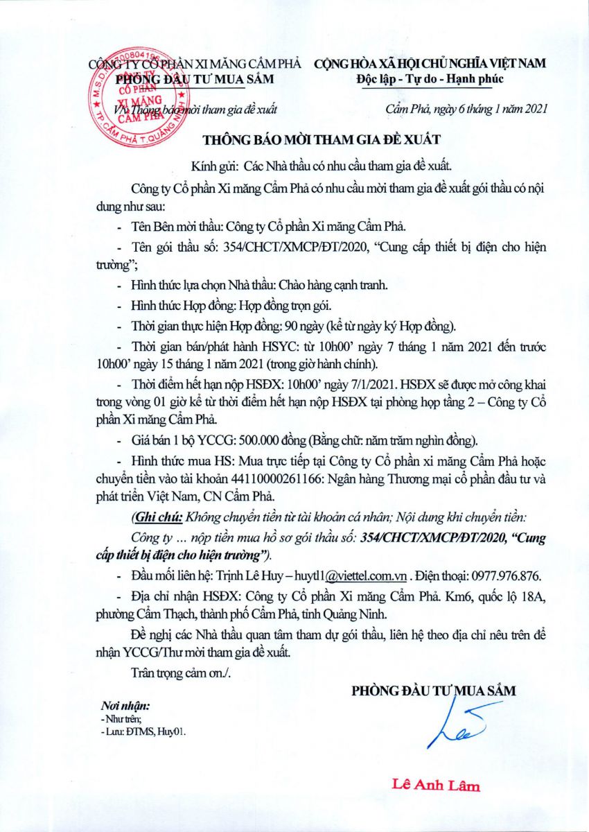 Thông báo mời tham gia đề xuất cung cấp thiết bị điện cho hiện trường