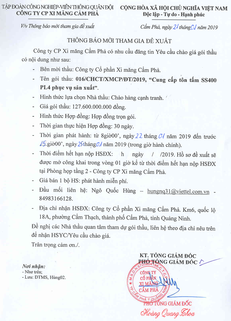 Thông báo mời tham gia đề xuất cung cấp tôn tấm SS400 PL4 phục vụ sản xuất