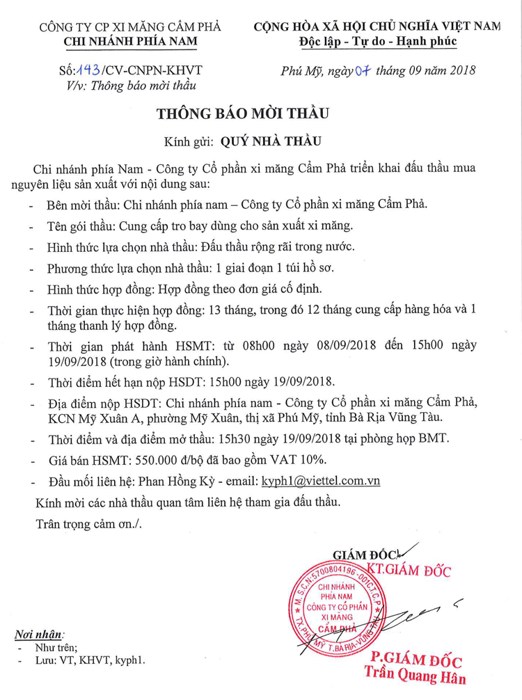 Thông báo mời tham gia đề xuất cung cấp tro bay sản xuất xi măng