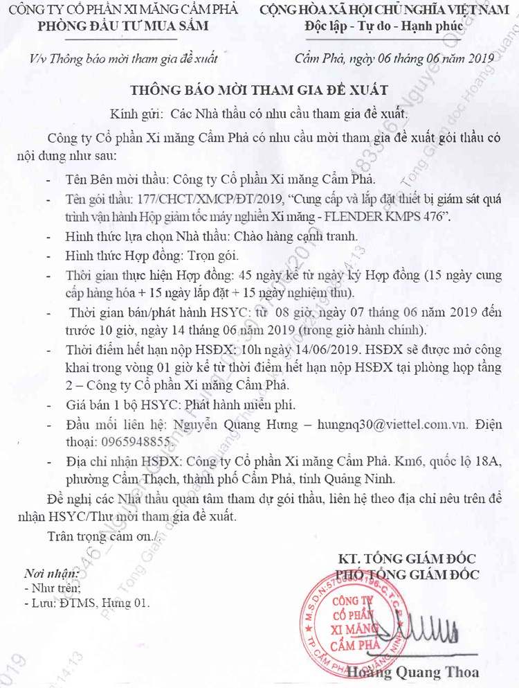Thông báo mời tham gia đề xuất Cung cấp và lắp đặt thiết bị giám sát quá trình vận hành Hộp giảm tốc máy nghiền Xi măng FLENDER KMPS 476