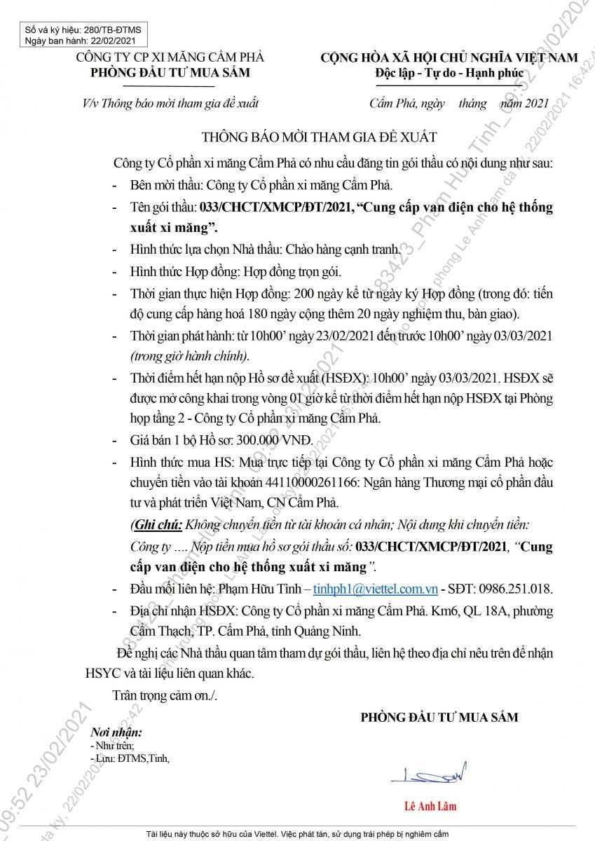 Thông báo mời tham gia đề xuất cung cấp van điện cho hệ thống xuất xi măng