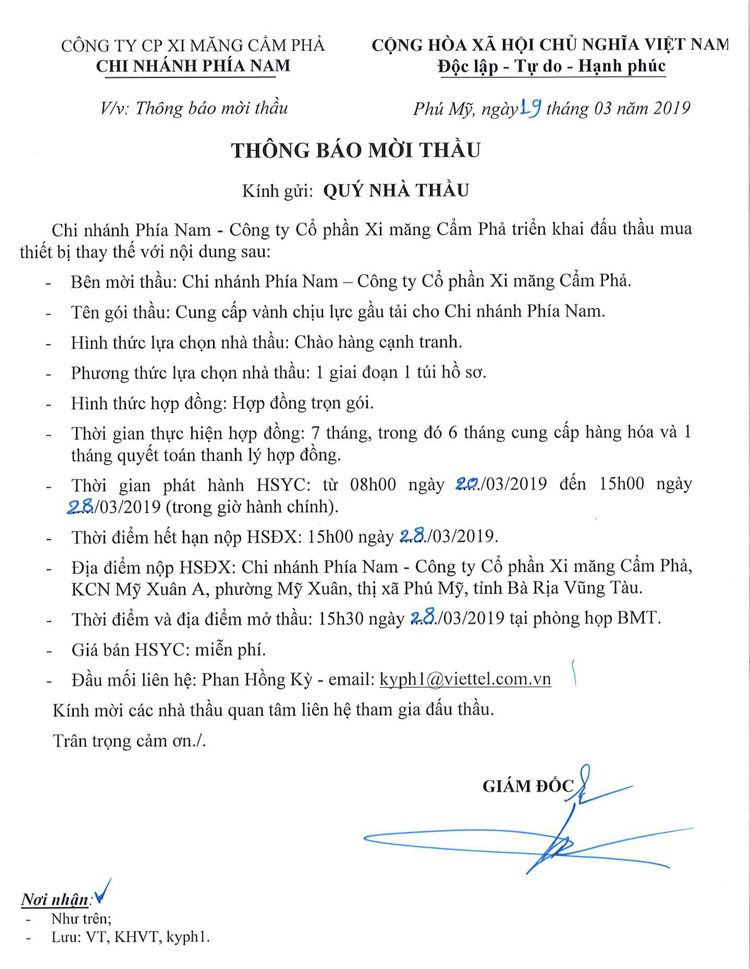 Thông báo mời tham gia đề xuất cung cấp vành chịu lực gầu tải cho Chi nhánh phía Nam