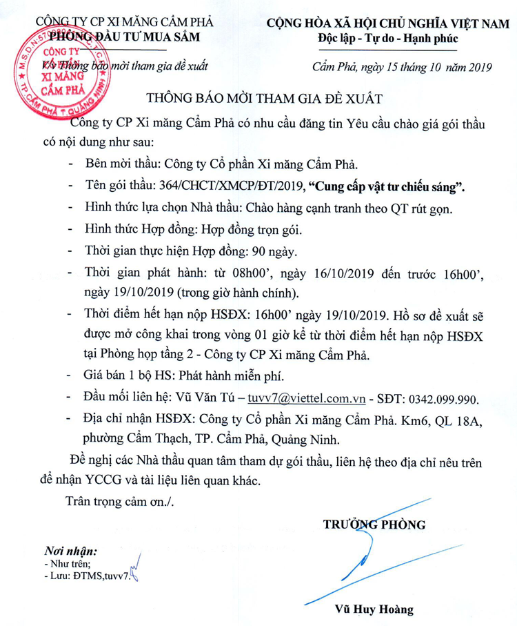 Thông báo mời tham gia đề xuất Cung cấp vật tư chiếu sáng