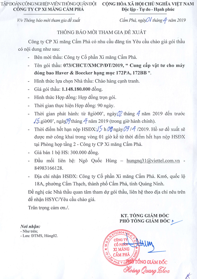 Thông báo mời tham gia đề xuất cung cấp vật tư cho máy đóng bao Haver & Boecker hạng mục 172PA, 172BB