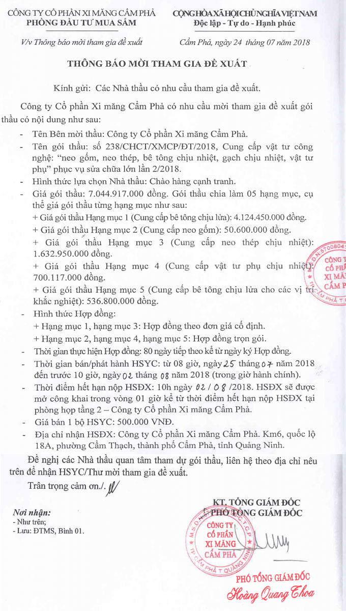 Thông báo mời tham gia đề xuất cung cấp vật tư công nghệ: Neo gốm, neo thép, bê tông chịu nhiệt, gạch chịu nhiệt