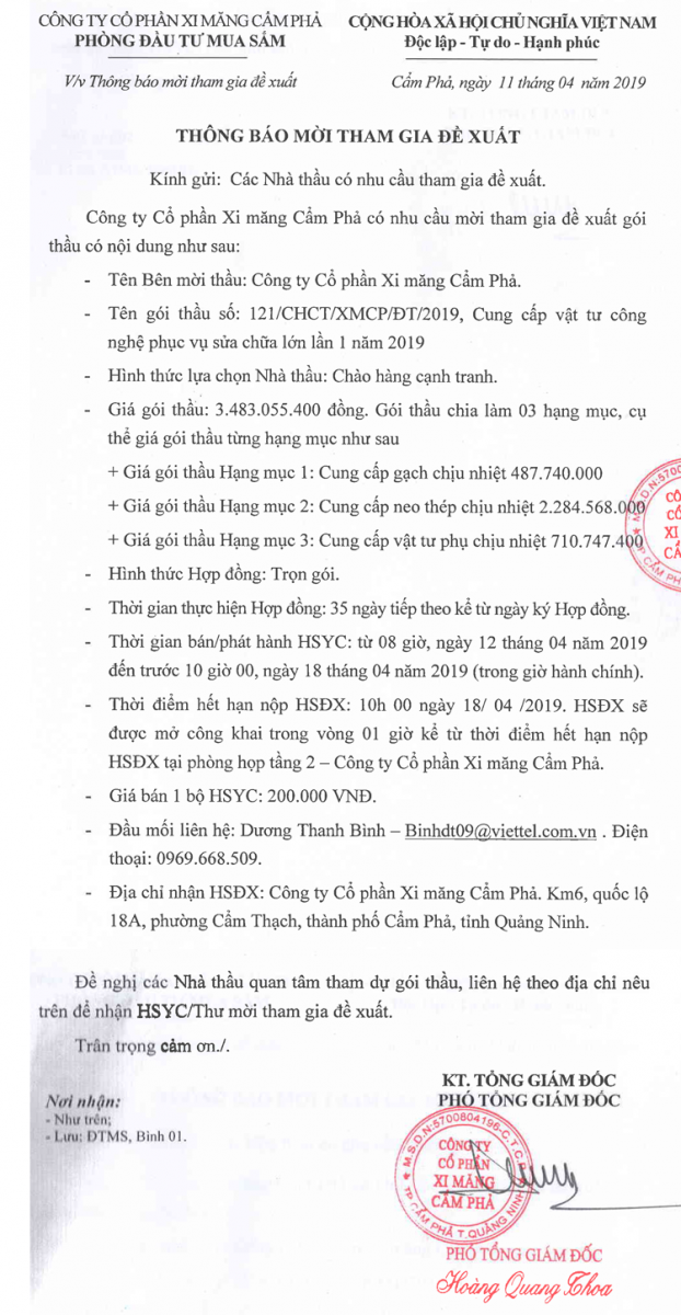 Thông báo mời tham gia đề xuất cung cấp vật tư công nghệ phục vụ sửa chữa lớn lần 1 năm 2019