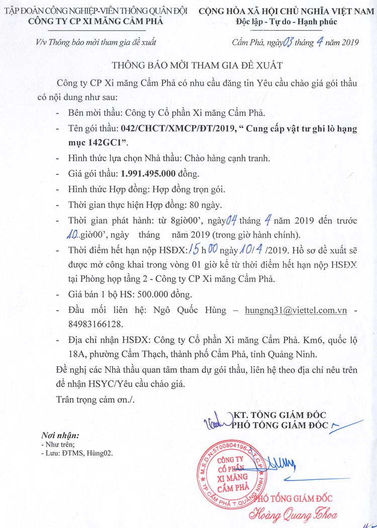 Thông báo mời tham gia đề xuất cung cấp vật tư ghi lò hạng mục 142GC1