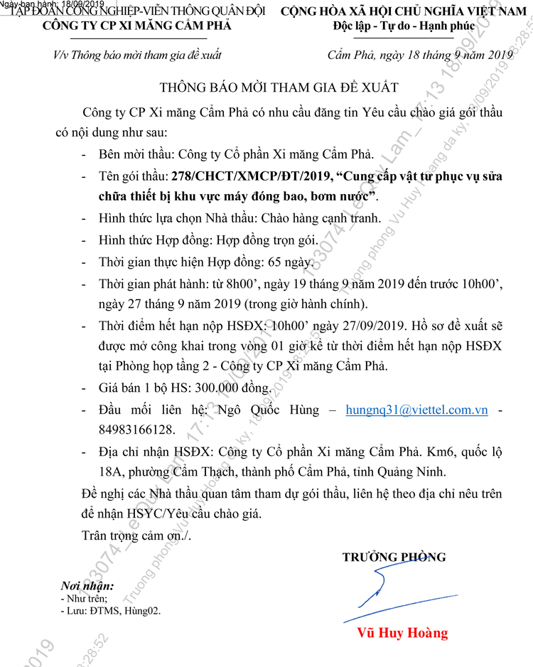 Thông báo mời tham gia đề xuất Cung cấp vật tư phục vụ sửa chữa thiết bị khu vực máy đóng bao, bơm nước