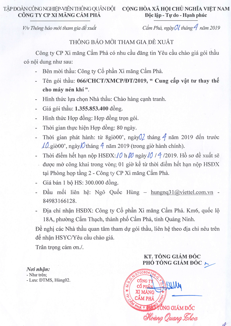 Thông báo mời tham gia đề xuất cung cấp vật tư thay thế cho máy nén khí