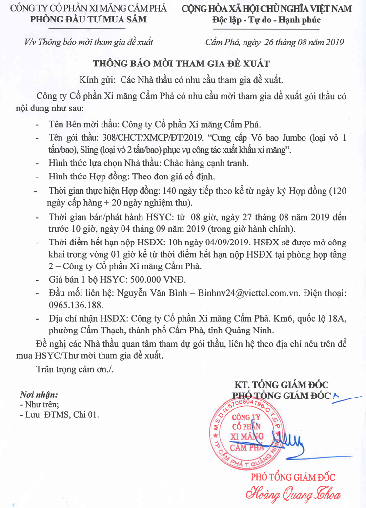 Thông báo mời tham gia đề xuất Cung cấp vỏ bao Jumbo (loại vỏ 1 tấn/bao), Sling (loại vỏ 2 tấn/bao) phục vụ công tác xuất khẩu xi măng