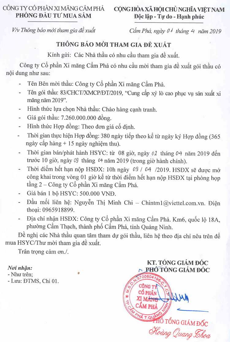 Thông báo mời tham gia đề xuất cung cấp xỉ lò cao phục vụ sản xuất xi măng năm 2019