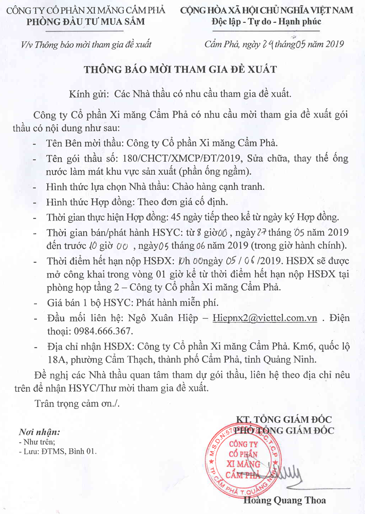 Thông báo mời tham gia đề xuất sửa chữa, thay thế ống nước làm mát khu vực sản xuất (phần ống ngầm)