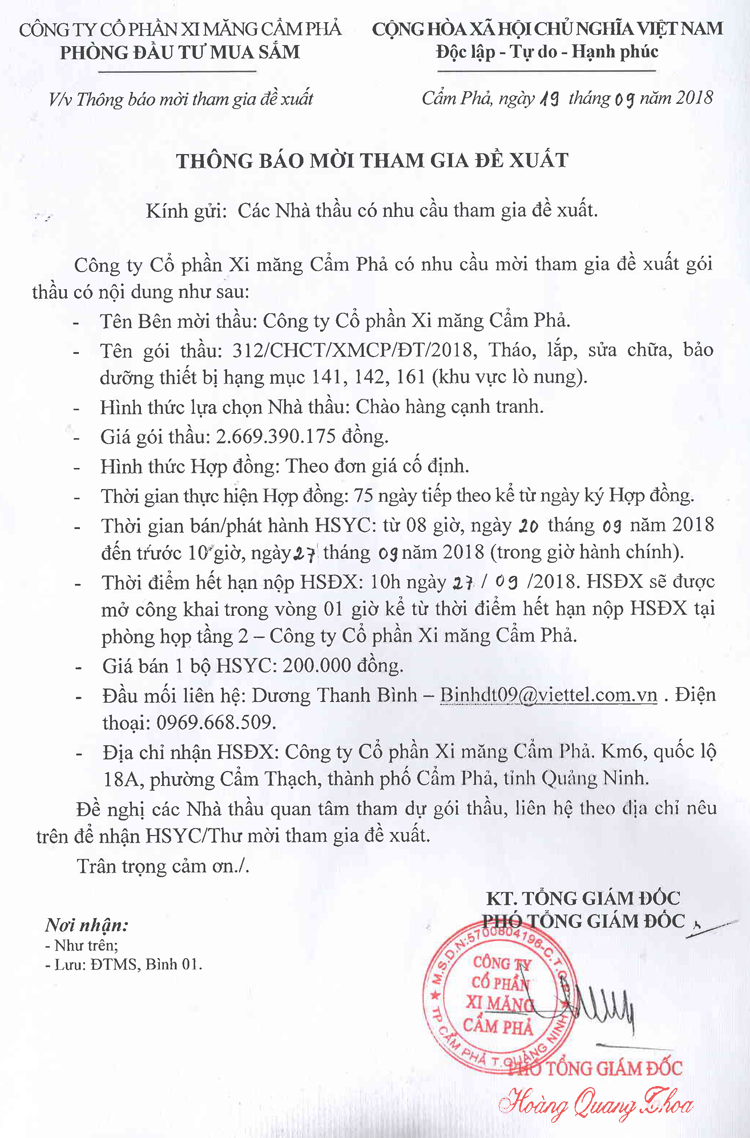 Thông báo mời tham gia đề xuất tháo lắp, sửa chữa, bảo dưỡng thiết bị hạng mục 141, 142, 161