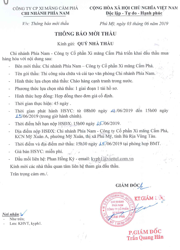 Thông báo mời tham gia đề xuất thi công sửa chữa và cải tạo văn phòng Chi nhánh phía Nam