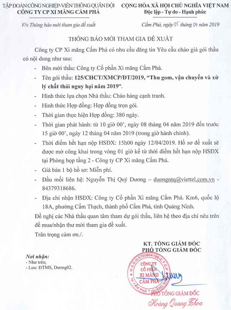 Thông báo mời tham gia đề xuất thu gom, vận chuyển và xử lý chất thải nguy hại năm 2019
