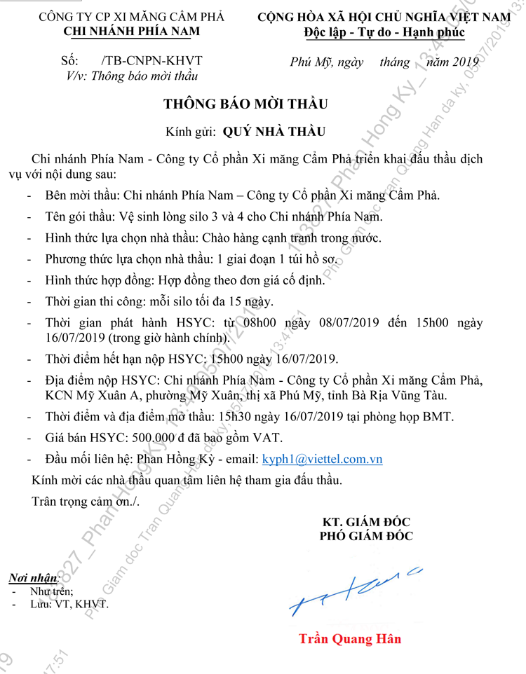 Thông báo mời tham gia đề xuất Vệ sinh lòng silo 3 và 4 cho Chi nhánh Phía Nam