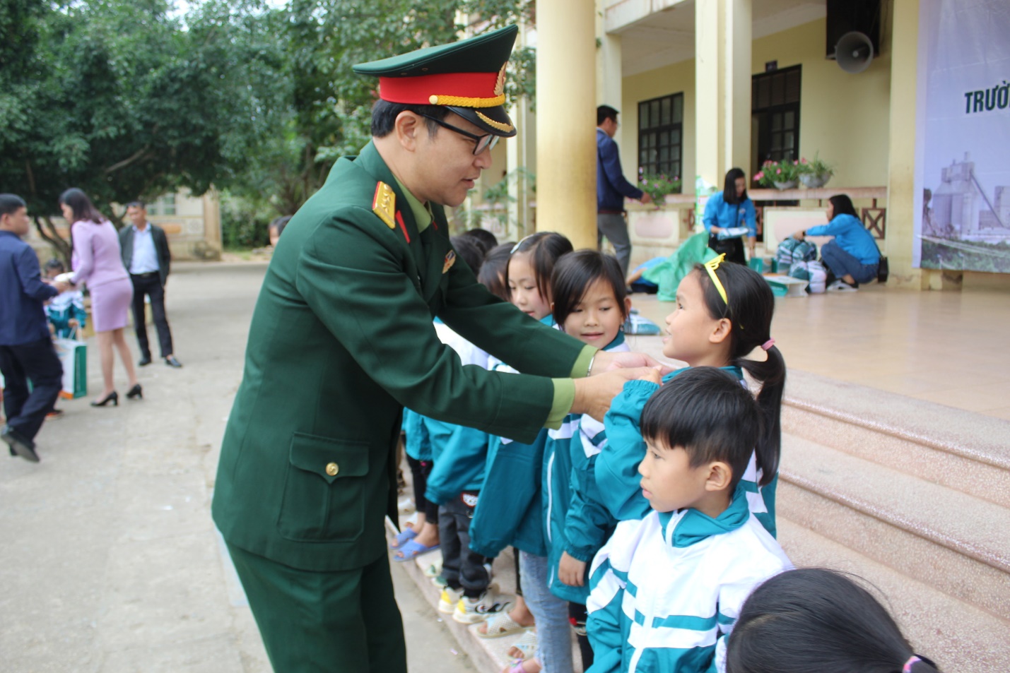 Đ/c Thượng tá Tăng Bá Tuyên – Bí thứ Đảng ủy, Phó Tổng Giám đốc Công ty trao tặng áo cho các em học sinh trường Tiểu học xã Lương Mông