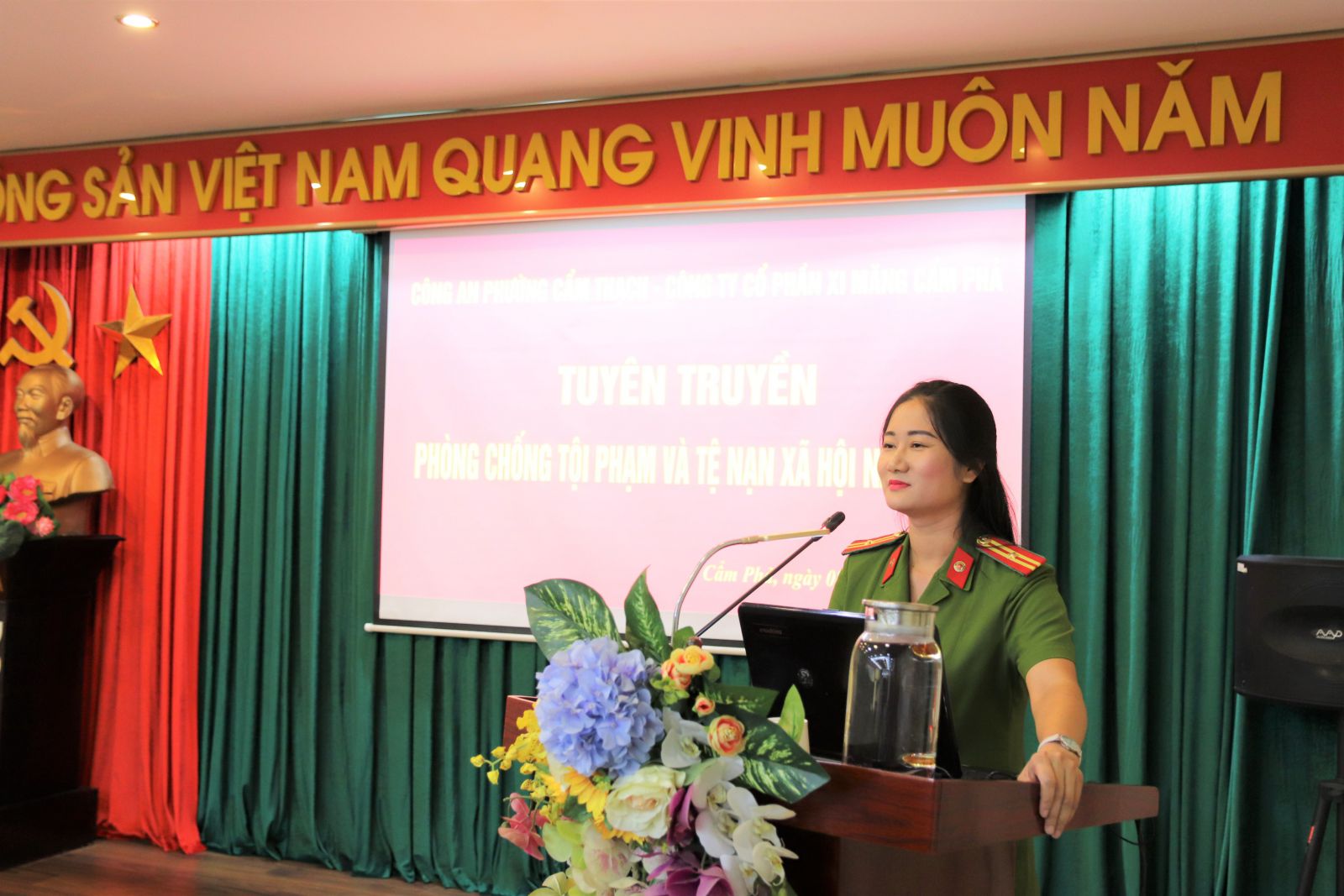 Với tinh thần “Thượng tôn pháp luật”, nhằm nâng cao nhận thức về trách nhiệm chính trị và chấp hành pháp luật cũng như quy định của địa phương và đơn vị, vào lúc 14h30 cùng ngày, tại hội trường tầng 3 của Công ty đã tổ chức buổi tuyên truyền, phổ biến kiến thức pháp luật, nhận diện những nguy cơ về tệ nạn và cách phòng chống tội phạm, tệ nạn xã hội năm 2020 với sự hướng dẫn trực tiếp của đồng chí thiếu tá Nguyễn Thị Thanh Hảo, trưởng công an phường Cẩm Thạch. Tham dự buổi tuyên truyền có sự tham gia của Ban lãnh đạo Công ty và các đồng chí trưởng/phó các cơ quan, đơn vị và hơn 30 CBCNV đại diện cho các phòng, ban, phân xưởng tại Nhà máy chính của Công ty.